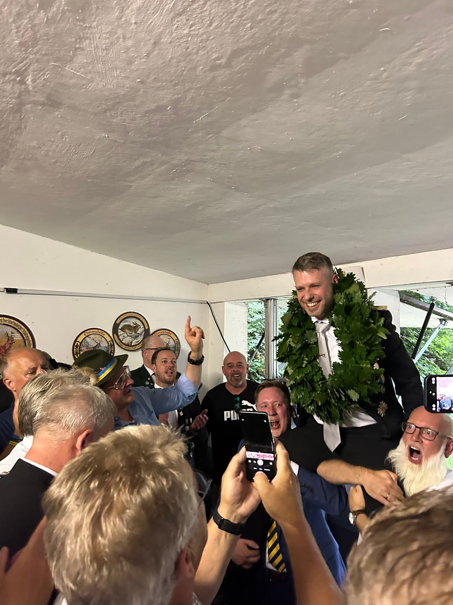 Mit großer Spannung wurde auf diesen Moment gewartet. Erst um 18.34 Uhr erlöste Hansmann die Wartenden oben auf dem Kohlbuschberg und unten am Alten Markt. Dies wird ein sprichwörtlich heißes Jahr für Hansmann werden. Repräsentationspflichten für die Gesellschaft als auch der kommende Wahlkampf als Bürgermeisterkandidat. Als Schütze von Kindesbeinen an, weiß Offizier Patrick Hansmann allerdings auch, wie der Hase läuft. Im Endkampf lieferten sich Frank Hanfler, Moritz Marl, Thorsten Runge, Michael Fuchs und Thomas Römer mit Hansmann eine heiße Wettkampfphase, in der Hansmann dann das glücklichere Händchen hatte.