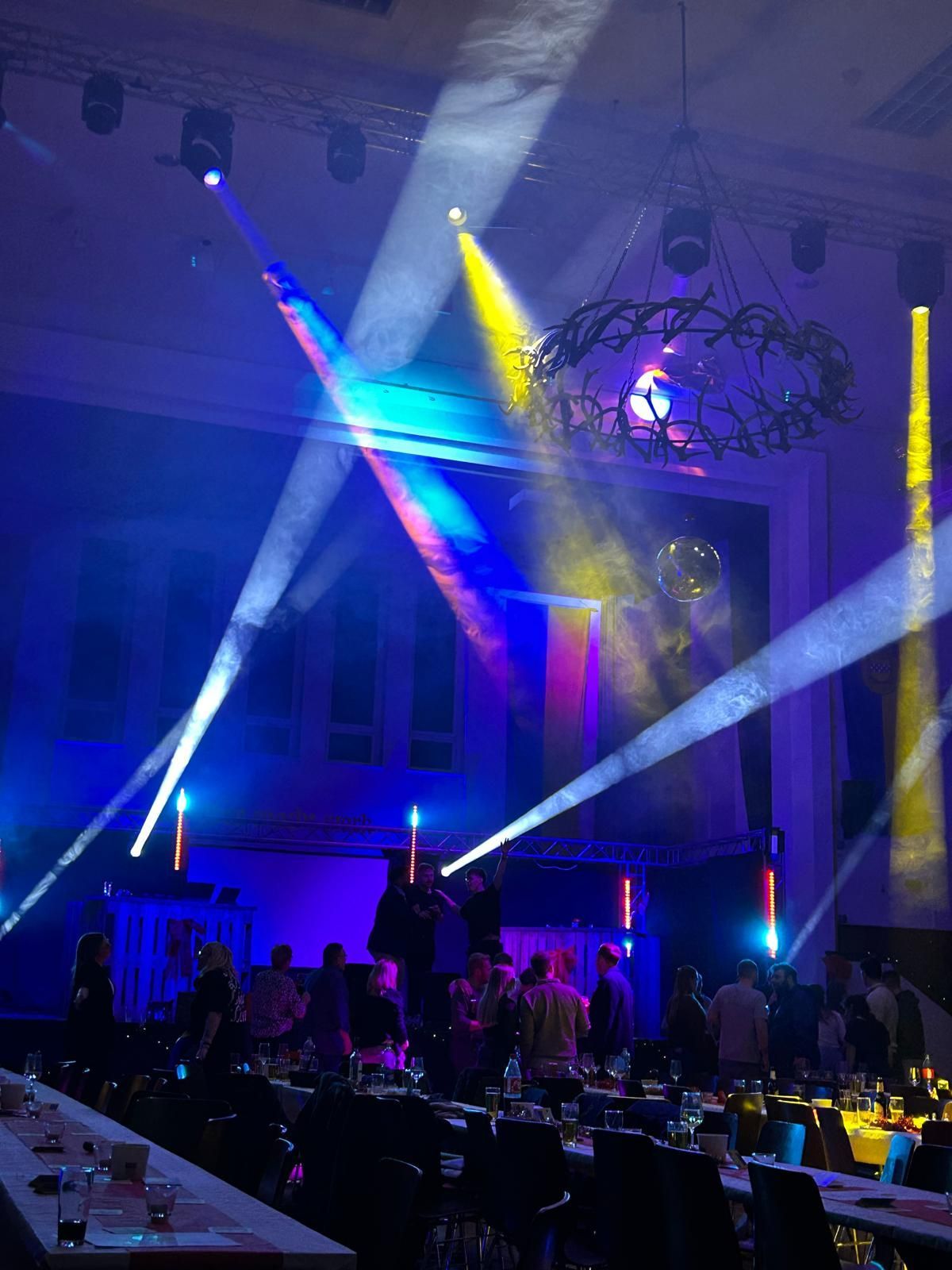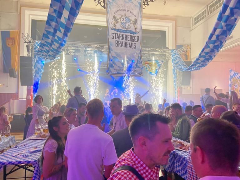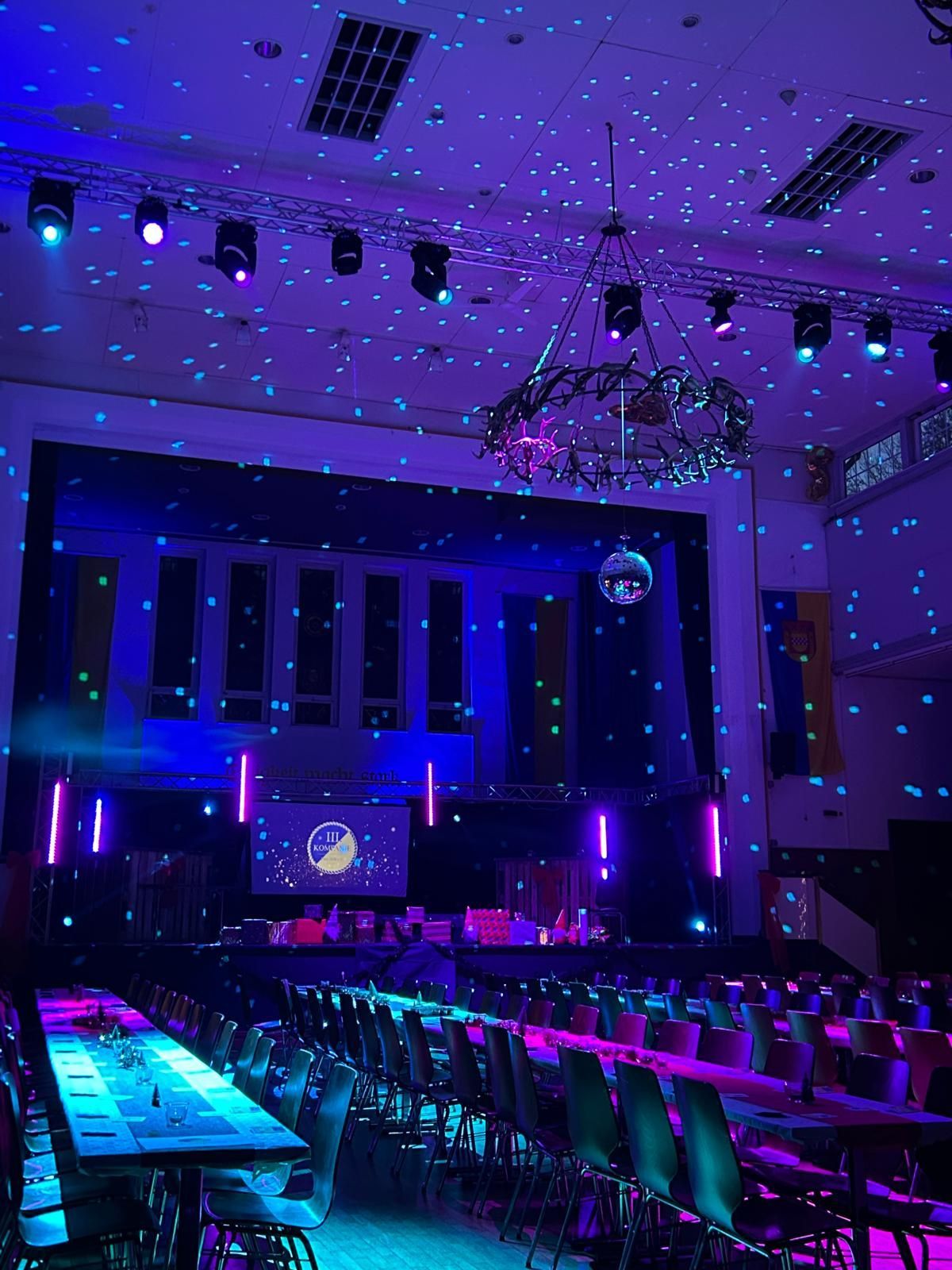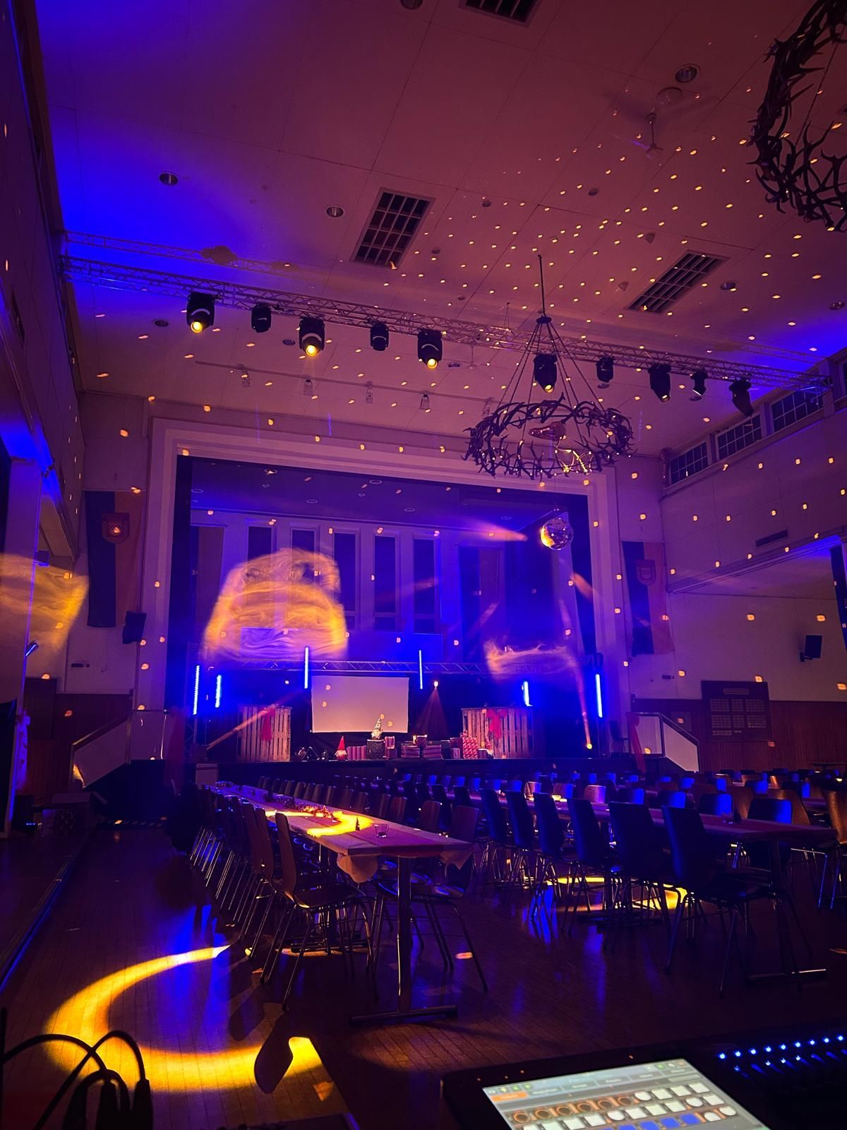 - Eine große Bühne mit seitlichem Zugang zur Sektbar, ideal für Bühnenprogramme, Bands oder Theateraufführungen